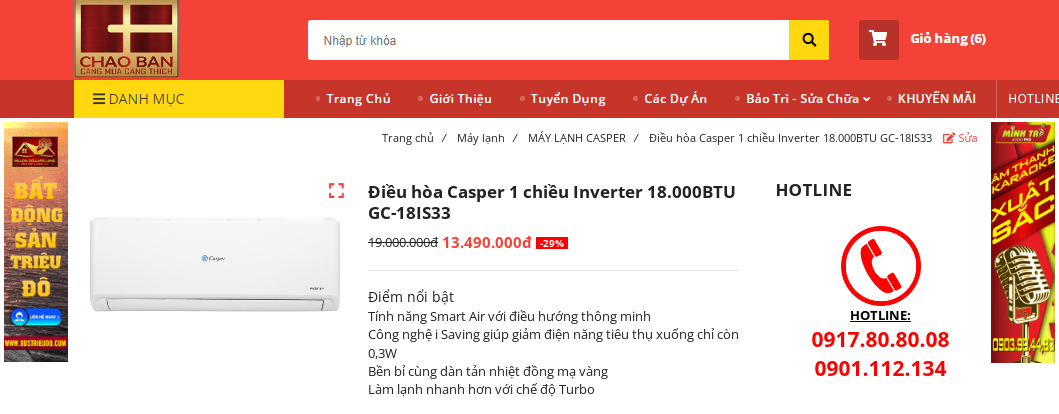 3) Điều hòa Casper 1 chiều Inverter 18.000BTU GC-18IS33