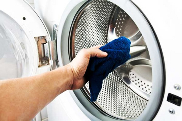Bước 3: Sau đó, xả hết nước trong máy ra và dùng khăn khô để thấm hết nước bên trong, mở cửa máy giặt để bên trong khô hoàn toàn.Điê·Theo: D·
