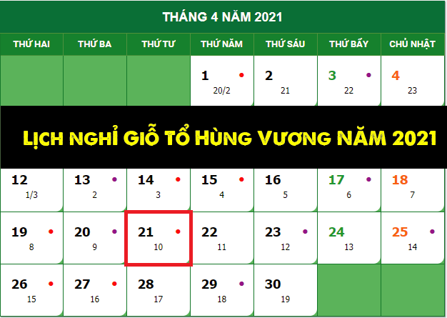 Tiếp sau kỳ nghỉ Tết Nguyên đán Tân Sửu, cán bộ, công chức, viên chức, người lao động có thêm một kỳ nghỉ dài vào các ngày Giỗ tổ Hùng Vương (10/3 âm lịch), Giải phóng miền Nam, thống nhất đất nước 30/4 và Quốc tế Lao động 1/5.