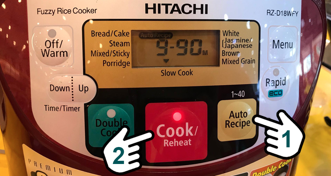 Chế độ nấu Double Cook của nồi cơm điện Hitachi sẽ giúp các món cơm ngon hơn nhờ được nấu với nồi công suất lớn và lòng nồi dày 3.0mm.