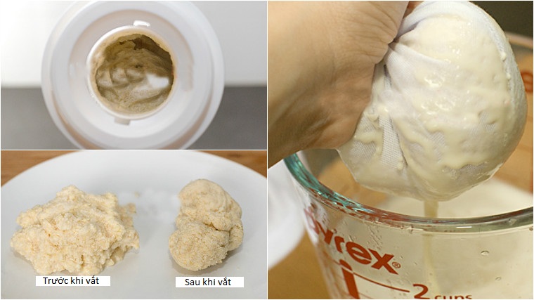 Đừng vội bỏ đi phần bã đậu trong máy xay sinh tố vì chúng có rất nhiều dưỡng chất. Múc bã đậu cho vào vải lọc, rồi bóp mạnh để chắt phần sữa trong bã. Sau khi làm xong, sẽ thấy bã đậu khô đi và nhỏ lại.