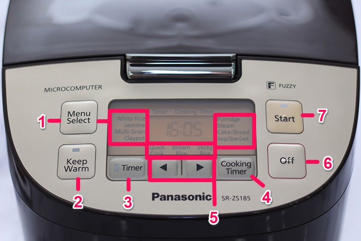 1 – Nút tùy chọn các chức năng nấu của nồi được cài đặt sẵn, gồm 13 chế độ nấu là nấu cơm trắng (White Rice), gạo thơm (Jasmine), ngũ cốc (Multi Grain), gạo nếp (Sticky Rice), gạo lứt (Brown Rice), cơm niêu (Claypot), nấu cháo (Porridge), hấp (Steam), làm bánh (Cake), làm bánh mì (Bread), ninh (nấu cơm chậm – Slow Cook), nấu cơm nhanh (Quick Cook), nấu súp (Soup).