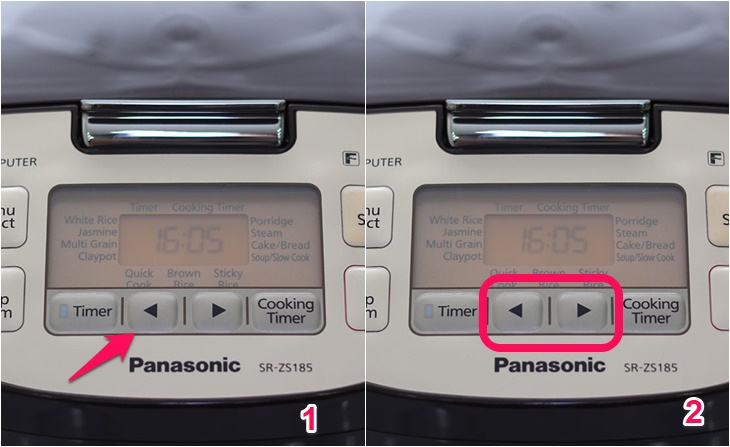 Bước 1: Kết nối điện cho nồi, nhấn và giữ nút ◄ hoặc nút ► trong hơn 1 giây rồi nhả ra khi có 1 tiếng bíp, thời gian trên màn hình hiển thị sẽ bắt đầu nhấp nháy.