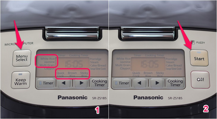 Bước 1: Nhấn nút Menu Select để chọn chức năng nấu gạo trắng, gạo thơm, ngũ cốc, nấu nhanh, gạo lứt hay gạo nếp. Khi chọn đúng chức năng bạn muốn, dấu ◄ sẽ trỏ về chức năng đó trên màn hình hiển thị và đèn ở nút Start sẽ nhấp nháy.