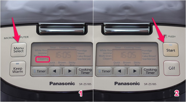 Bước 1: Nhấn nút Menu Select để chọn chức năng nấu cơm niêu, khi dấu ◄ trỏ về chữ “Claypot” trên màn hình thì bạn đã chọn đúng chức năng. Đèn ở nút Start sẽ nhấp nháy.