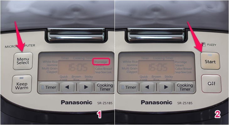 Bước 1: Nhấn nút Menu Select chọn chức năng nấu cháo, khi dấu ► trỏ về chữ “Porridge” trên màn hình hiển thị và đèn ở nút Start nhấp nháy, bạn đã chọn đúng chức năng.