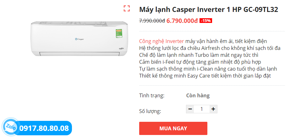 3. Máy lạnh Casper Inverter 1 HP GC-09TL32