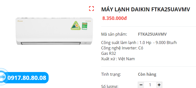 Daikin FTKA25UAVMV có công suất làm lạnh 9000 Btu/h (thích hợp phòng có diện tích 10 - 15 m² hoặc từ 30 - 45 m³ khí).