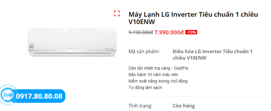 2. Máy Lạnh LG Inverter Tiêu chuẩn 1 chiều V10ENW