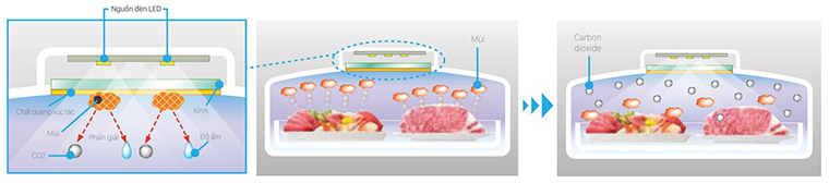 Sử dụng chất quang xúc tác và ánh sáng từ đèn Led tạo môi trường lưu trữ thực phẩm tối ưu.