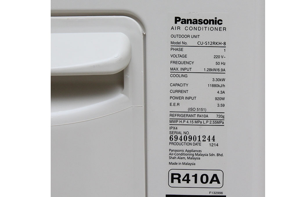 Công suất tiêu thụ tối đa được quy đổi từ công suất định mức (công suất điện) của máy lạnh thường được in trên nhãn sản phẩm của nhà sản xuất như hình dưới.