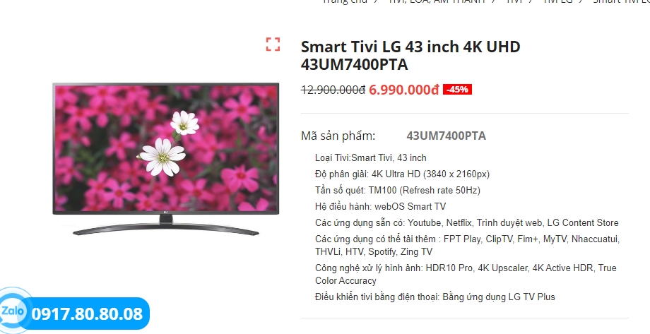 2. Smart Tivi LG 43 inch 4K UHD 43UM7400PTA