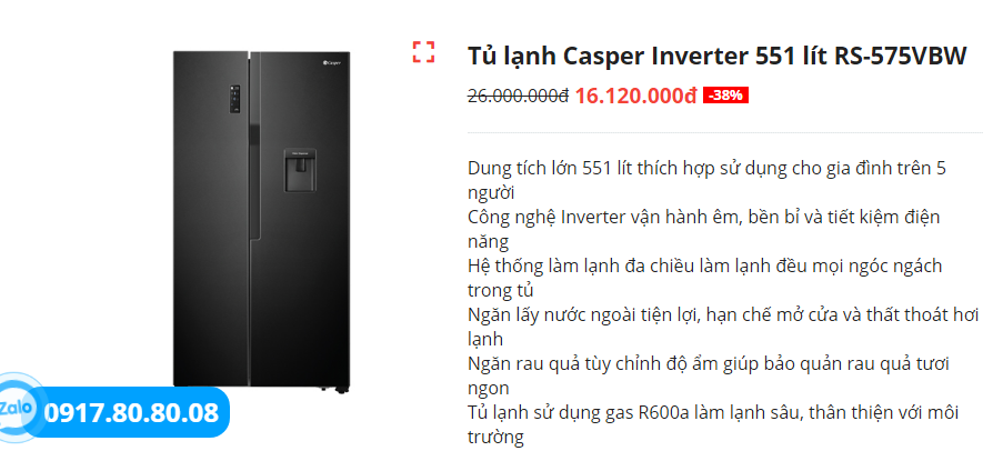 2. Tủ lạnh Casper Inverter 551 lít RS-575VBW