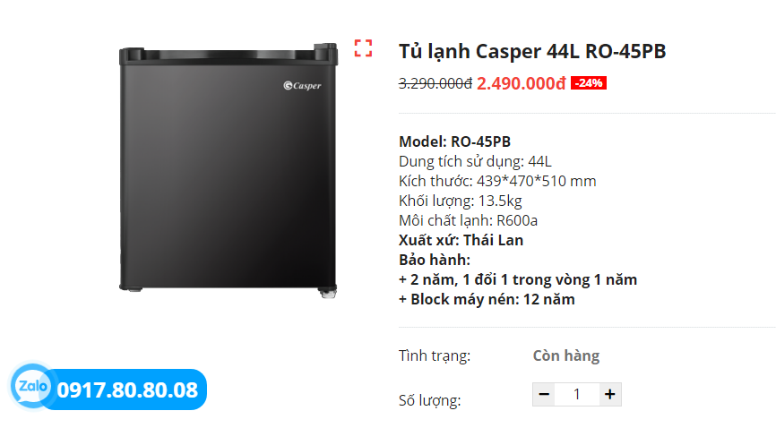 Tủ lạnh Casper 1 cửa 44L RO-45PB - Cánh tủ đảo chiều thông minh, lựa chọn hoàn hảo cho văn phòng, khách sạn