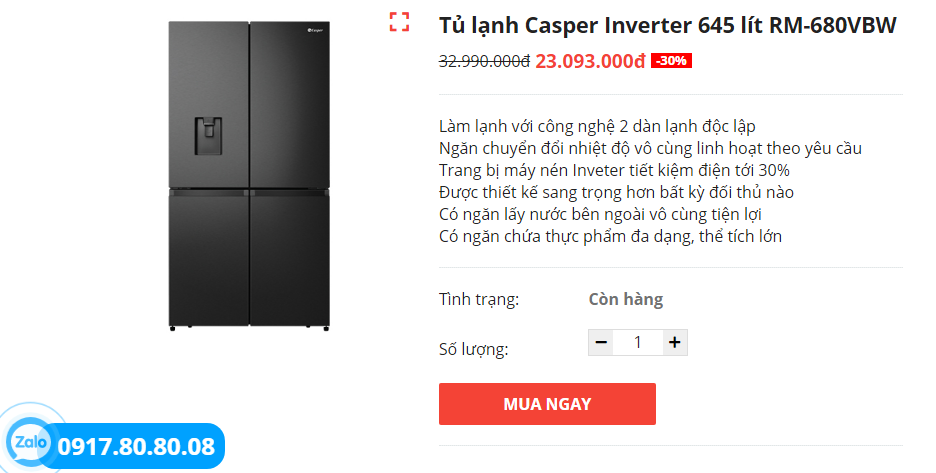 1. Tủ lạnh Casper Inverter 645 lít RM-680VBW