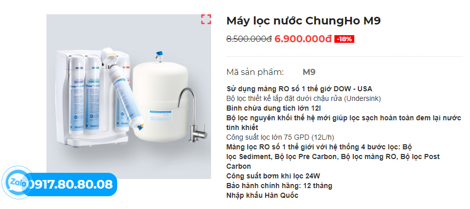 Máy lọc nước ChungHo M9 đang có giá deal sốc tại điiện máy Chào Bán