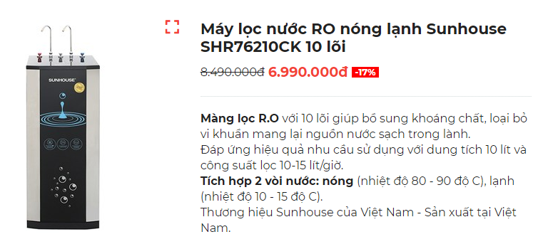 2) Máy lọc nước RO nóng lạnh Sunhouse SHR76210CK 10 lõi