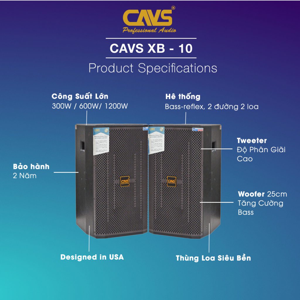 Loa CAVS XB10 là dòng sản phẩm rất phù hợp cho việc lắp đặt các phòng hát karaoke gia đình, phòng trà, Caffe và các phòng hát kinh doanh karaoke chuyên nghiệp và các phòng karaoke gia đình với diện tích lớn 30m2 trở lên với chất lượng âm thanh cực kỳ tốt, kỹ thuật và công nghệ từ các kỹ thuật CAVS đã xứ lý các dãi tần Bass, Mid, Treble đến từng chi tiết nhỏ trong Phân Tần của loa khiến cho âm thanh đầu ra được xứ lý sạch, trong trẻo và chắc chăn