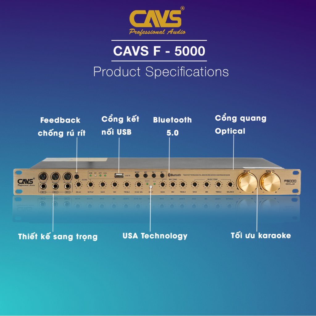 Tiếp nối sự thành công và sự phát triển của thương hiệu CAVS, Chúng tôi đã nghiên cứu và cho ra những sản phẩm Vang cơ để tiện lợi hơn cho người yêu âm nhạc, với sự thành công của Model Vang Cơ CAVS 102E, thì CAVS cho ra mắt sản phẩm Model vang cơ CAVS F-5000 Gold hỗ trợ trộn âm thanh, xử lý tín hiệu âm thanh cho chất lượng tốt nhất. Sản phẩm ứng dụng công nghệ tiên tiến mới nhất hiện nay với mạch chống hú Anti-Feedback chống ríu rít cực kỳ hiệu quả. Vang cơ CAVS F-5000 Gold đang là lựa chọn tốt nhất cho mọi dàn âm thanh, là bản nâng cấp của dòng vang cơ CAVS