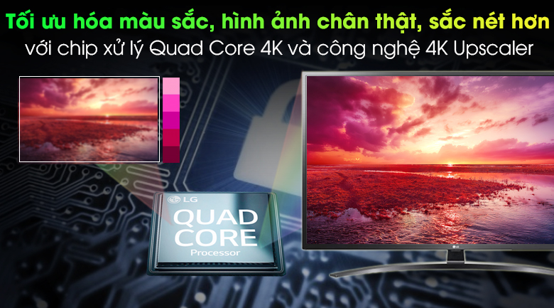 Smart tivi LG trang bị bộ xử lý Quad Core 4K có khả năng giảm nhiễu, tái tạo màu sắc, độ tương phản sống động, sắc nét, kết hợp công nghệ 4K Upscaler nâng cấp chất lượng hình ảnh có độ phân giải thấp lên gần chuẩn 4K, cho hình ảnh trung thực, tự nhiên hơn.