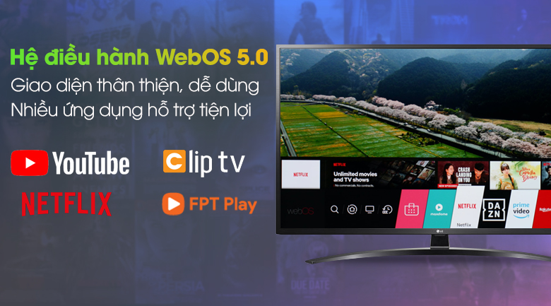 Tivi LG vận hành trên nền tảng hệ điều hành WebOS 5.0 hiện đại với giao diện đơn giản, tiện thao tác, sở hữu kho ứng dụng đa dạng có nhiều tiện ích như: YouTube, Netflix, FPT Play, ZingTV, Clip TV, Spotify,... đáp ứng nhu cầu giải trí của mọi thành viên trong gia đình.