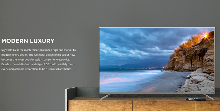 Smart Tivi Skyworth 50 inch 4K UHD 50G2 thiết kế hiện đại, kiểu dáng sang trọng. Công nghệ sản xuất và tấm nền màn hình tiên tiến nhất hiện nay đã tạo nên một tuyệt tác nghệ thuật với đường viền hợp kim sang trọng, chân đế được gia cố vững chắc giúp đứng vững trên mọi mặt phẳng.