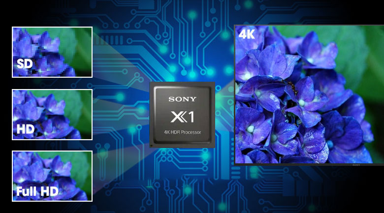 Hiển thị hình ảnh rõ nét, giảm nhiễu hình ảnh và nâng cấp hình ảnh có chất lượng thấp lên gần chuẩn độ phân giải 4K nhờ Chip X1 4K HDR Processor và công nghệ 4K X-Reality PRO