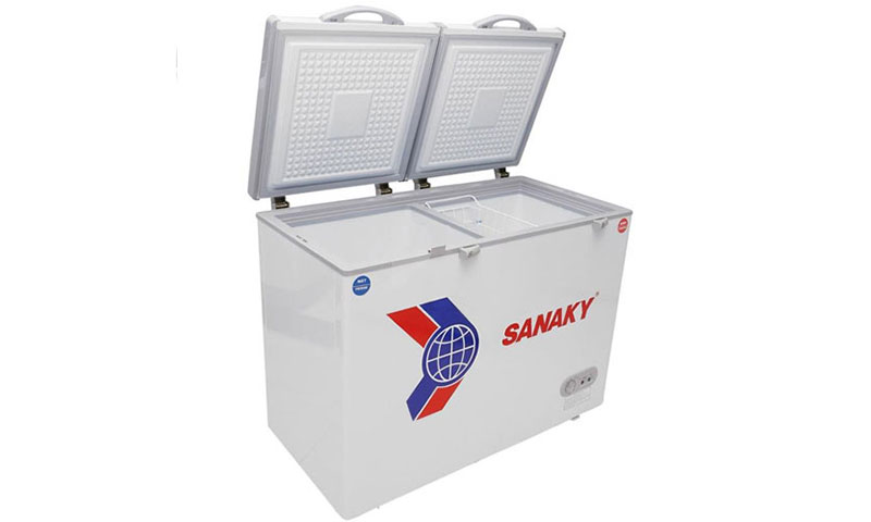 Cánh Tủ đông Sanaky VH-568W2 được thiết kế dày, có hai nắp mở, kiểu mở lật lên, tay cầm nổi rất tiện, bản lề có thể chỉnh cánh tủ với góc rộng 70 độ, có khóa an toàn giúp dễ dàng cho hoặc lấy thực phẩm trong tủ.